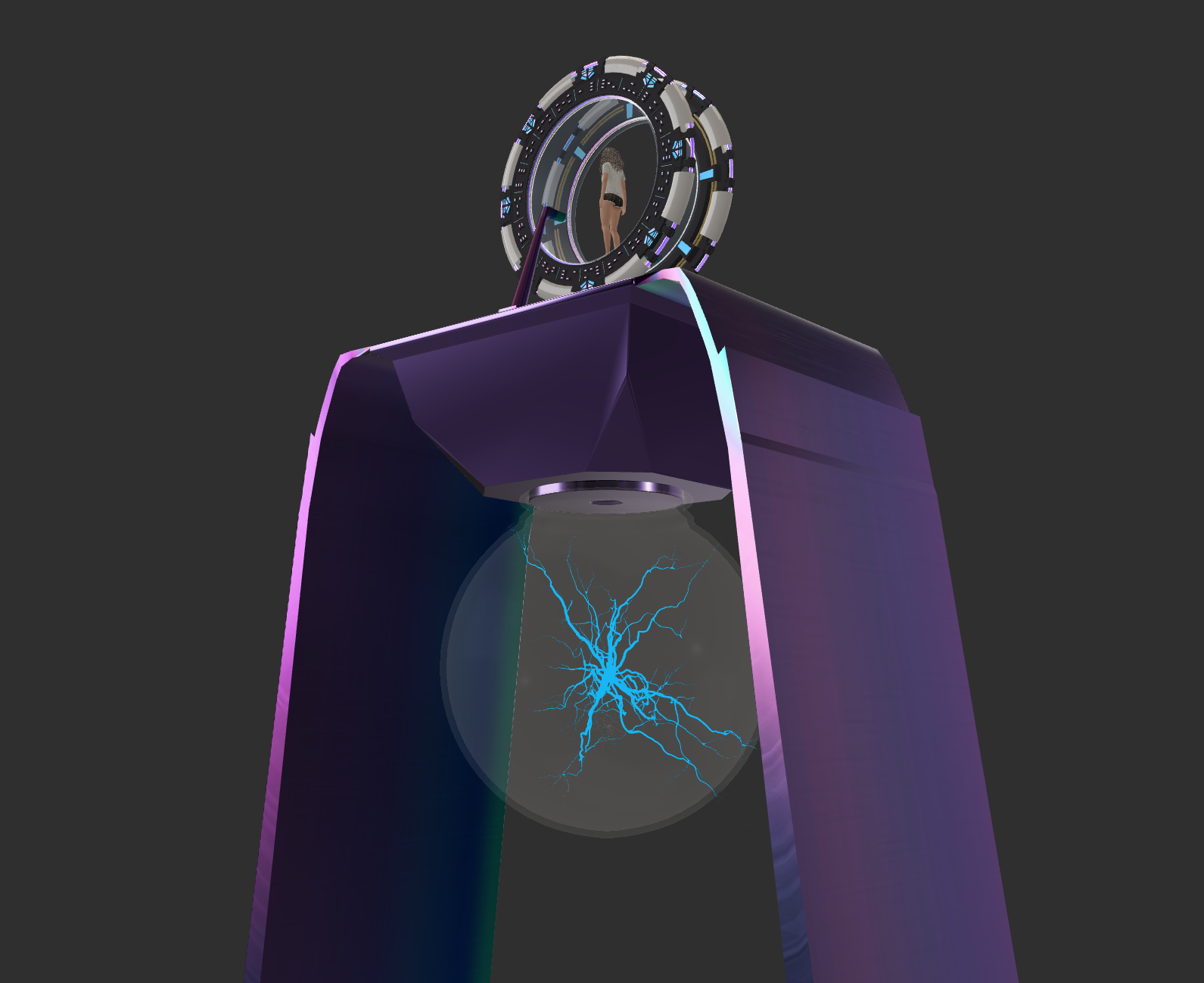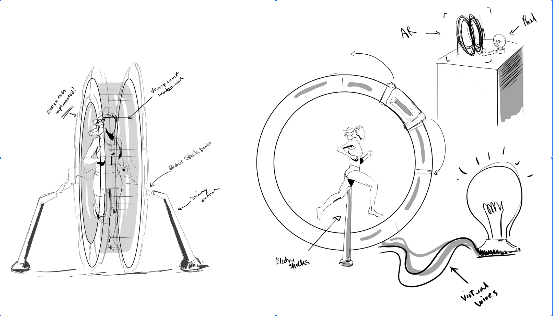 Parallax is an interactive AR installation exploring the complex and at times conflicting relationship between the artist, their artwork, and the audience. The piece had its premiere at MUTEK AE in 2024. The artist takes a step back, objectively assessing the process of artmaking and the inherent vulnerability that her artworks feed on. To generate more authenticity and be perceived as more desirable, the artworks aim to further expose the artist. The experience presents a personal take on the Milgram Experiment study conducted in the early 1960s and expands on the dynamic of obedience and destruction. Instead of a conductor commanding the participants to administer the electric shock-like in the Milgram Experiment, the artwork does so by means of enticing the audience through interactivity. Based on the audience’s proximity to the avatar, electric shocks will be triggered respectively and the avatar will, in response, run faster. The avatar’s speed on the hamster wheel manifests itself in the intensity of light generated in both iterations of the work. The initial prototype uses a physical source (Blue LEDs) in the real world working with ultrasound sensors to calculate the audience’s distance, and the other one presents a plasma globe in the AR world, reacting to the avatar’s pace based on the position of the audience. In the final piece premiered at MUTEK, instead of a physical LED, a crystal power globe is designed as part of the augmented world, and it fluctuates in lighting intensity based on the avatar's speed.