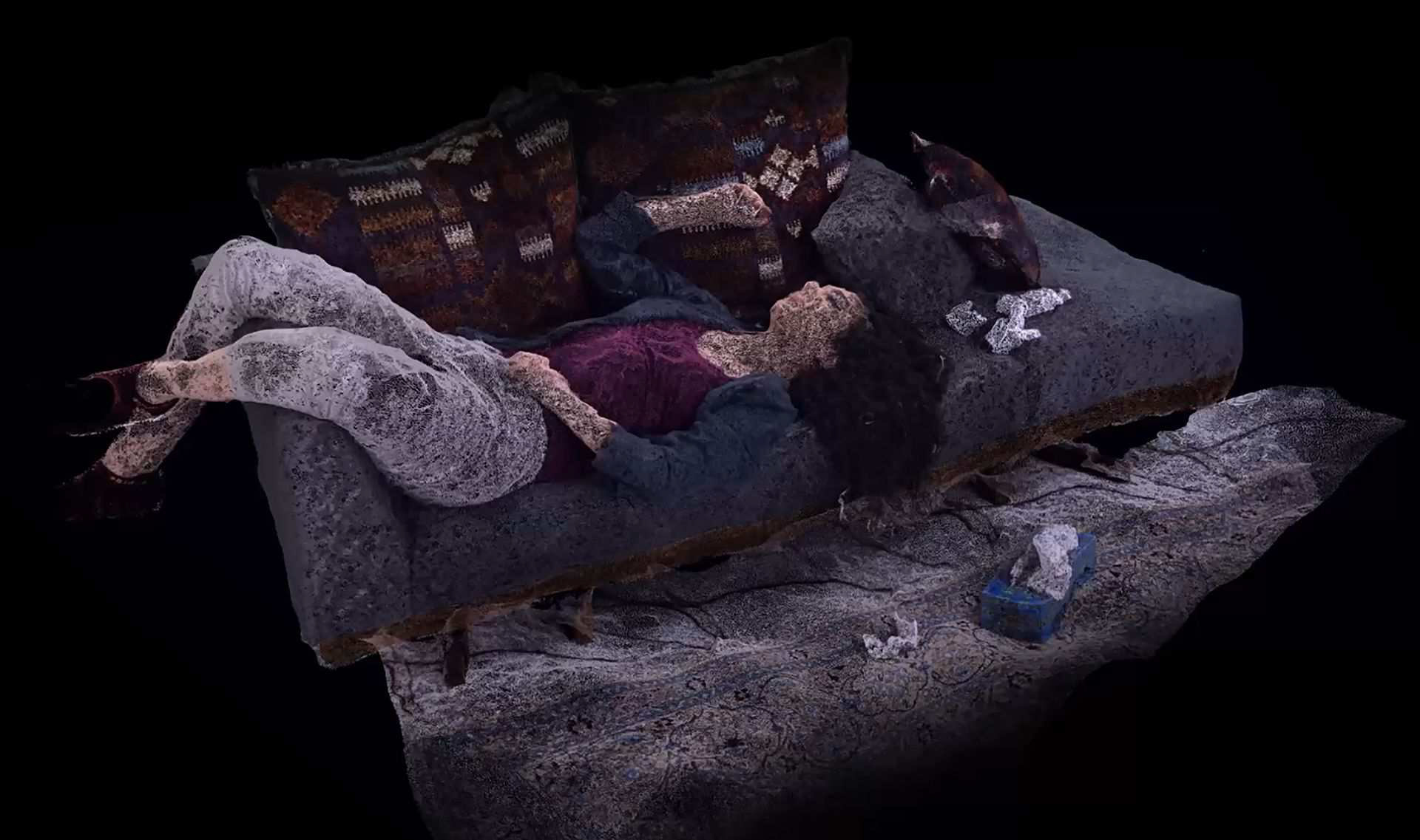 Drained is the third experiment in the self-portrait series. It was done using photogrammetry for the 3D scanning and point cloud generation and was then programmed for animation via noise inputs. The self-portrait series is meant to expose the artist in her most vulnerable state while setting new aesthetics and technical benchmarks in her body of work. Drained tries to imitate the structure of memory in a minimalistic manner as it sheds its layers through time, leaving behind only fragments of existance. The music of the piece was chosen from a dark-ambient electronic piece called Awakeoneironaut by Behrang Najafi.